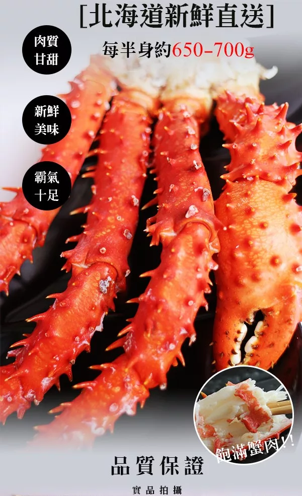 【小老闆】活生凍北海道帝王蟹半身肩(600g~700g)x2組是最近我買過算cp值蠻高的一個商品,下面是賣場提供的商品簡介: